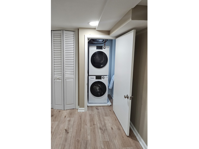 The unit offers a separate, walkout entrance, bedroom w/closet, full bath, table-space kitchen, and in-unit washer/dryer.